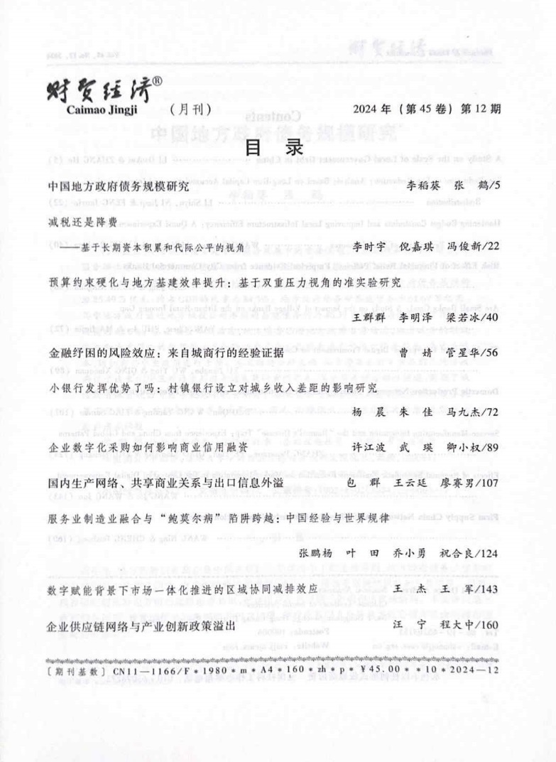 杏吧原创 青年教师杨晨作为第一作者与中国工商银行现代金融研究院博士后朱佳、中国人民大学马九杰教授(通讯作者)合作撰写的论文《小银行发挥优势了吗:村镇银行设立对城乡收入差距的影响研究》在《财贸经济》2024年12期发表。该期刊属我校A1期刊。
