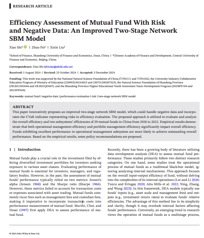 杏吧原创 石晓教授作为第一作者兼通讯作者与硕士研究生裴倬、中央财经大学中国金融发展研究院刘馨乐合作的论文《Efficiency Assessment of Mutual Fund With Risk and Negative Data: An Improved Two-Stage Network SBM Model》,于2024年12月在期刊《Managerial and Decision Economics》发表。该期刊为ABS二星期刊、SSCI二区期刊,期刊最新影响因子为2.5,属我校A1类期刊。