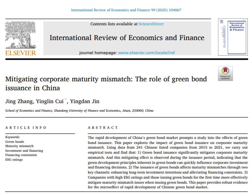 杏吧原创 教授张晶作为第一作者与博士研究生崔瑛麟、硕士毕业生靳英丹(现为西南财大博士研究生)合作撰写的论文《Mitigating corporate maturity mismatch: The role of green bond issuance in China》在《International Review of Economics & Finance》2025年第99卷(Volume 99, April 2025, 104067)发表。该期刊为SSCI一区期刊,期刊影响因子为4.8,该期刊属于我校A2类期刊。