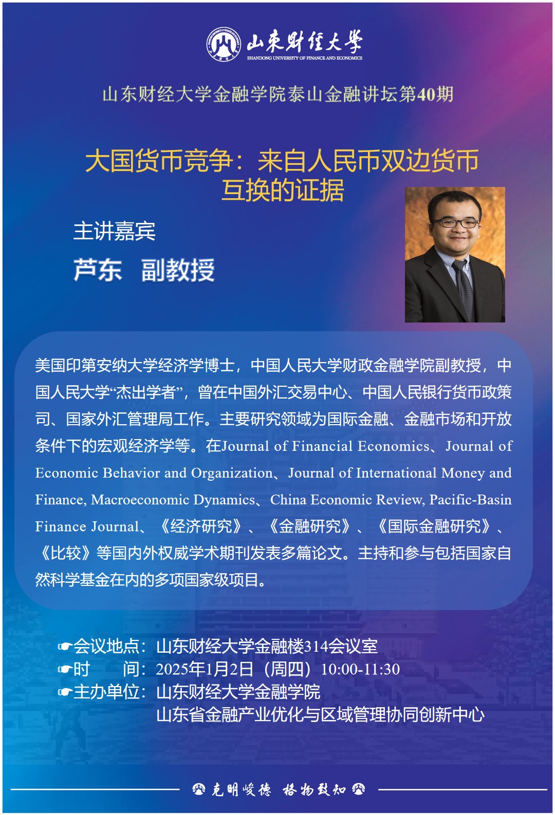 芦东,美国印第安纳大学经济学博士,中国人民大学财政杏吧原创 副教授,中国人民大学“杰出学者”,曾在中国外汇交易中心、中国人民银行货币政策司、国家外汇管理局工作。主要研究领域为国际金融、金融市场和开放条件下的宏观经济学等。在Journal of Financial Economics、Journal of Economic Behavior and Organization、Journal of International Money and Finance, Macroeconomic Dynamics、China Economic Review, Pacific-Basin Finance Journal、《经济研究》、《金融研究》、《国际金融研究》、《比较》等国内外权威学术期刊发表多篇论文。主持和参与包括国家自然科学基金在内的多项国家级项目。