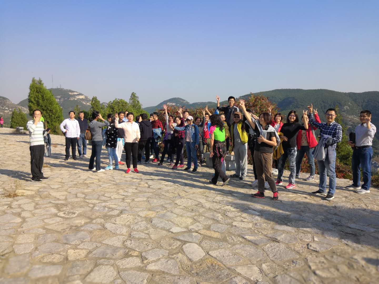 共有70余名教职工参加此次登山活动,大家结伴同行,从金鸡岭山脚下依山而上,攀登到金鸡岭顶峰,一路上登高望远,享受阳光,对景言欢。