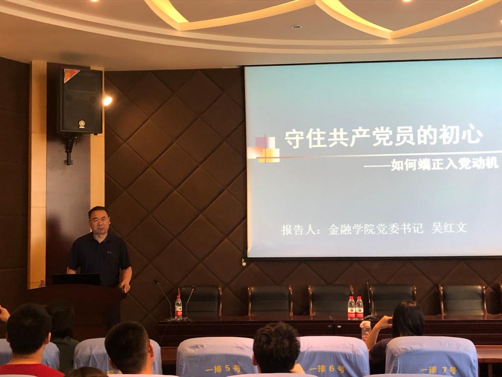 培训课上,吴书记强调,严明纪律是党员的生命线,要求所有党员发展对象要以正式党员标准要求严格要求自己,争取做一个合格党员。随后,吴书记从“共产党员的初心是什么”、“初心检验标准”等三个方面展开本次教育培训。他首先向大家阐述了“四个伟大”的重要意义,结合“不忘初心,牢记使命”主题教育,引用习近平总书记的系列讲话,向党员发展对象明确了党员的初心和使命。吴书记要求所有党员发展对象要做到“吃苦在前,享乐在后”,切实发挥出先进性和先锋性作用。他强调,党员发展对象要从思想上入党、政治上入党,牢记党员义务和权利,提出从政治、思想、理论等五个方面检验入党动机,为成为一名合格的预备党员打好基础。吴书记着重强调党员发展对象要“坚持不犯错误”,要自始至终同党中央保持高度一致,认真学习践行习近平新时代中国特色社会主义思想,作为金融学子更要着重经济问题,树立起强烈的经济意识。最后,吴书记就“如何守住初心”与党员发展对象进行深入交流,结合“三严三实”教育大家要牢记初心,坚守党员信念,做无愧于党、无愧于组织的合格党员。