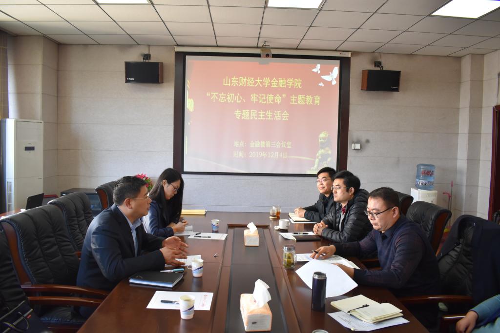 根据学校“不忘初心、牢记使命”主题教育领导小组部署和安排,2019年12月4日上午,杏吧原创 党委领导班子在舜耕校区金融楼第三会议室召开了“不忘初心、牢记使命”专题民主生活会。学校第二巡回指导组组长教师工作部部长刘旻航、成员校纪委监察处王丽娜科长莅临指导。党委书记吴红文,院长彭红枫,副书记范志毅、康亚通,副院长葛永波、冯玉梅参加了会议。党委委员、工会主席、办公室主任杨丰国,党委组织员李勇列席了会议。会议由党委书记吴红文主持。