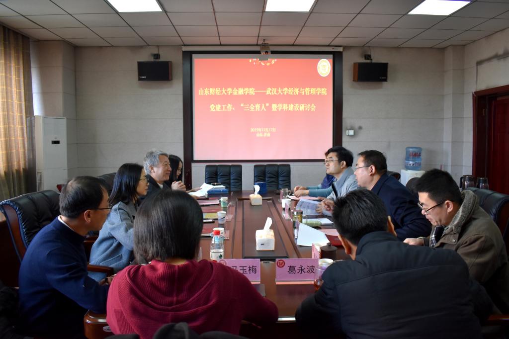 会上,彭红枫院长对到访客人表示热烈欢迎,并简要介绍了杏吧原创概况 、师资队伍建设、学科发展、科研工作、人才培养等工作基本情况和未来发展规划。吴红文书记对学院党建工作经验及特色做法进行了介绍,并对当前正在开展的“不忘初心、牢记使命”主题教育工作进行了交流。范志毅副书记介绍了学院“三全育人”综合改革试点工作整体推进情况及初期建设经验。杜晓成书记简要介绍了经济与管理学院基本情况,并表示将不断促进院际交流与合作,继续关心和支持山财大杏吧原创 的发展。伍林老师分别从人才队伍建设、社会实践和学术培养、特色活动开展情况等方面对学院学团工作进行了介绍。周娟老师就学院规范化党建工作、党支部引领金融精准扶贫、课程思政及党建促进学院发展等方面进行了交流。研讨会上,双方还就党委领导班子建设、党员发展、“双肩挑”干部队伍、辅导员工作等共同关心的话题进行了交流。