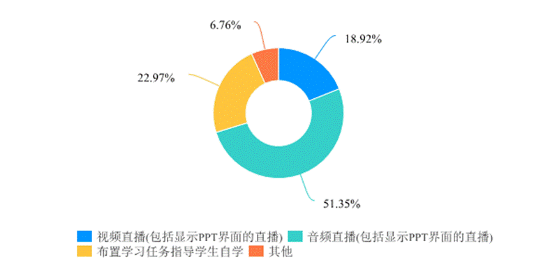 本轮在线教学活动中各位任课教师根据课程特点和技术条件采用了多种教学模式,一是混合式教学占比高,有36位老师(占比48.65%)将线开放课程(MOOC)资源引入教学活动,进而搭建起混合式教学模式。二是直播比例高,在部分教学平台直播功能遭遇网络拥堵或不具备视频直播功能的情况下,实现视频直播和音频直播的课程合计占比高达70.27%(图5)。三是教学手段灵活,有22.97%的课程通过布置学习任务指导学生自学的方式推进教学工作。教学手段方面,72位老师(占比97.3%)组织了在线答疑,70位老师(占比54.59%)给学生布置了作业,42位老师(占比56.76%)组织过学生讨论, 40位老师(占比54.05%)进行过在线测试。