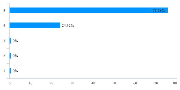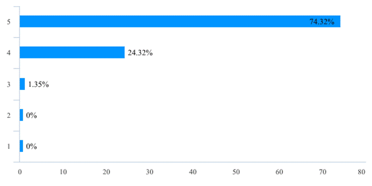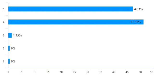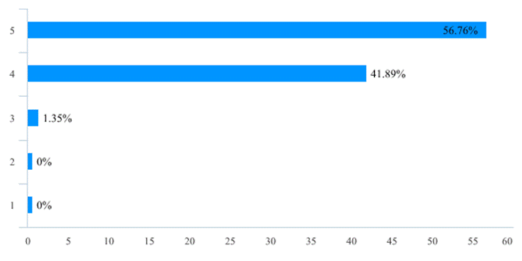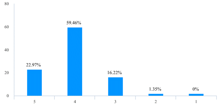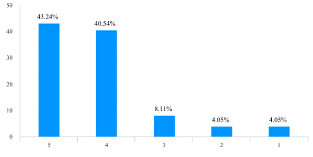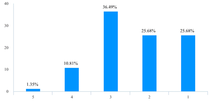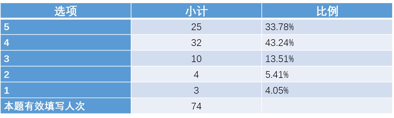 此次在线教学活动在一定程度可以说是前期在线开放课程和混合式教学改革成效的检验,也为后续教学改革的开展和混合式教学模式的推广奠定了基础。在此次在线教学活动之前,有57位老师(占比77.03%)已经使用了在线教学平台/工具开展辅助线下面授教学活动,在教学活动中,98.65%的老师认为自己对线上教学的软硬件环境有较高的熟悉程度(图12)。尤其是经过开课前的培训和准备工作以后,教师线上授课的困难程度已不算太高,83.78%的老师给线上教学前的组织和培训工作给出4分以上的评分(图13),87.85%的老师表示自己开展线上教学活动的困难程度在3分以下,仅有1位老师给出了5分的困难度(图14)。这表明在全面的组织发动和教师积极的努力下,绝大多数老师都能够掌握线上教学工具和方法。这也为未来教学改革尤其是混合教学模式的推广奠定了基础,68位老师(占比91.89%)表示会将线上教学活动的工具和经验移植到正式开学后的教学活动中(表2),57位老师(占比77.02%)对在线教学方式或工具的推荐度给出了4分以上评分(表3)。