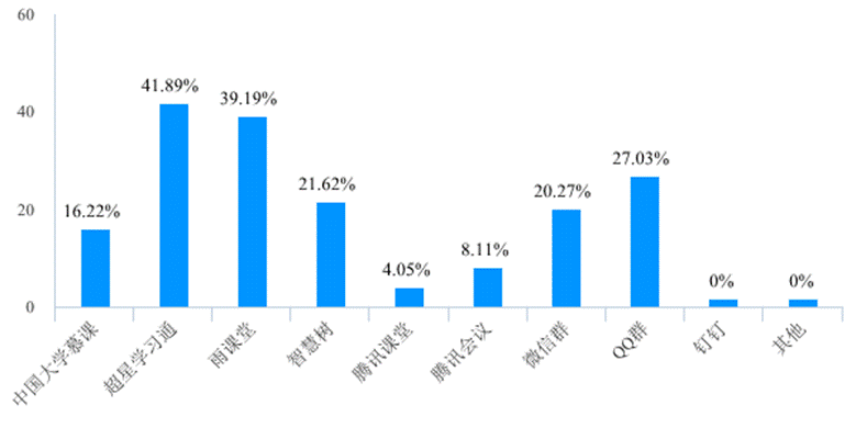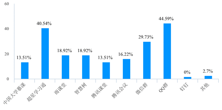 此次在线教学活动之前授课教师准备的在线教学工具比较丰富(图3),超星学习通、雨课堂两大工具均覆盖了40%左右的教师,QQ群、智慧树、微信群、中国大学慕课等教学平台和社交工具位居教学工具的第二梯队,腾讯课堂、腾讯会议等工具虽然不是本科在线教学的主流工具,但线上教学活动开始前,也有相当数量的老师将其作为工具储备。具体分析发现,有44位老师(占比59.50%)准备了两种以上教学工具,其中10名老师准备了3种以上教学工具,34名老师(占比45.95%)将微信群、QQ群等社交工具作为在线教学辅助工具。