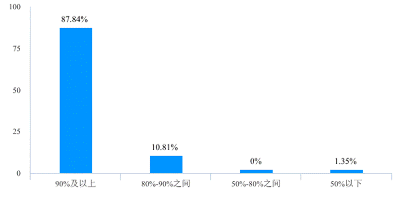 在线教学活动中,各位任课教师尽心尽责,凸显出学院教师高度的敬业精神和责任感。除了进行在线教学工具、教学形式和教学手段的准备以外,任课教师还在上课时间、教学资源和到课率等方面进行充分准备和严格把控。一是98.64%的老师会在课前及时告知学生教学大纲、教学进度、考核方式等课程要求(图6),所有老师都制作了适合在线授课的课件或修订更新课件内容(图7),98.65%的老师向学生提供了丰富的书目、文献、网络资源等教学资源(图8)。同时,各位老师还充分利用在线教学工具签到、打卡、点名、查看后台数据等手段检查学生到课情况,确保了较高的出勤率,87.84%的教学班学生出勤率在90%以上,98.65%的教学班学生出勤率在80%以上(图9)。此外,许多老师将立德树人和课程育人相结合,将课程思政融入课堂教学,调查发现有86.49%的老师表示给学生传授过提高学习能力和身心健康程度的内容(图10),63.51%的老师给学生讲解过如何正确看待和应对疫情(图11)。