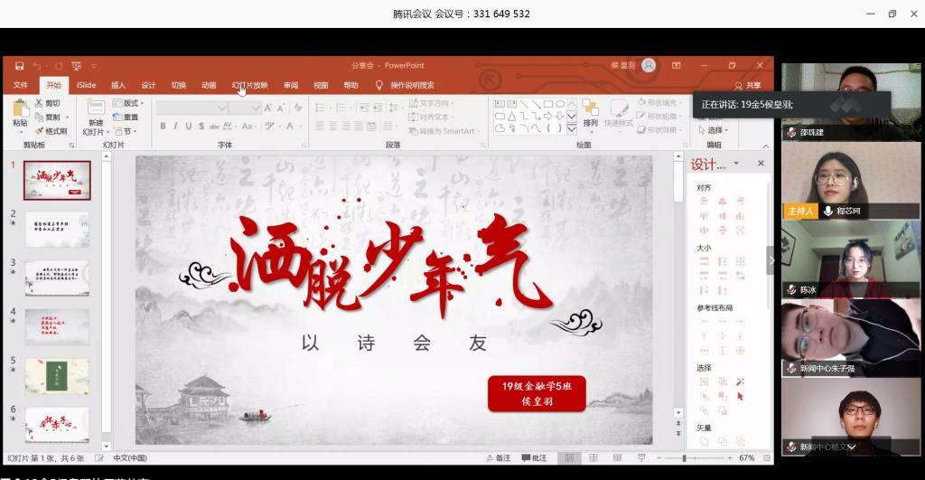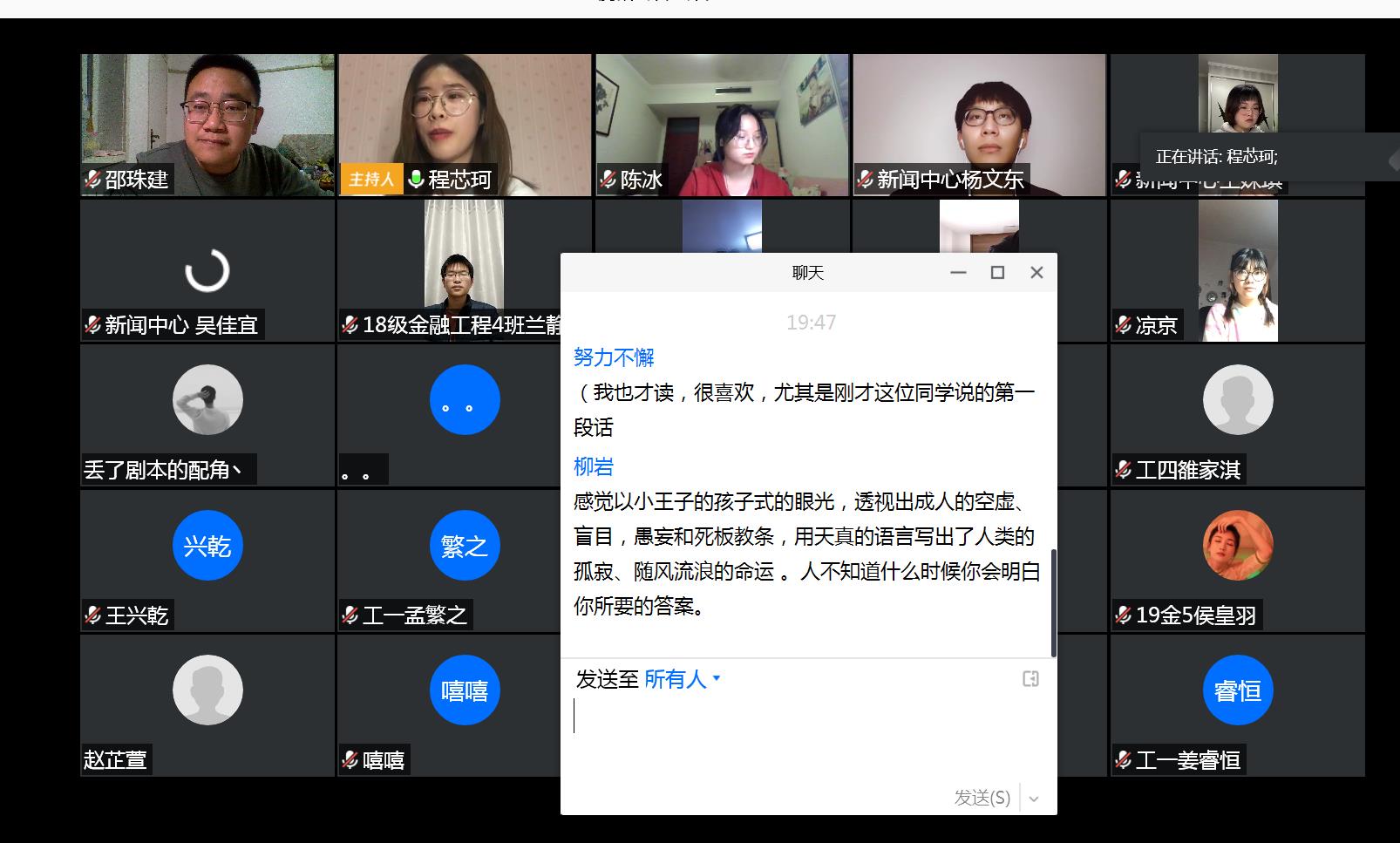 粗缯大布裹生涯,腹有诗书气质华。本次读书分享会为同学们提供了交流思想的良好平台,不仅开阔了视野,打开了思路,并且充分展现了当代大学生的人文素养和人文精神,营造了一场丰富的“云端盛宴”。