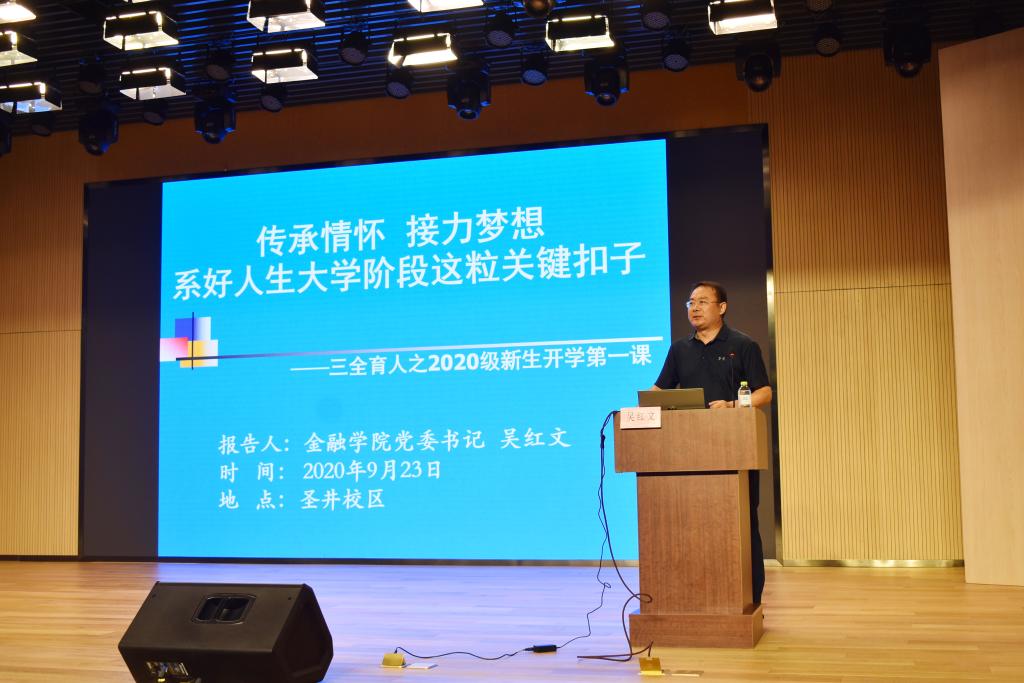 (通讯员:王姝琪)为帮助新同学全面适应大学生活,做好思想政治教育工作,9月23日晚杏吧原创 党委书记吴红文在圣井校区文化活动中心多功能厅举办以“传承情怀,接力梦想,系好人生大学阶段这粒关键扣子”为题的新生报告会。2020级全体新生现场聆听报告。
