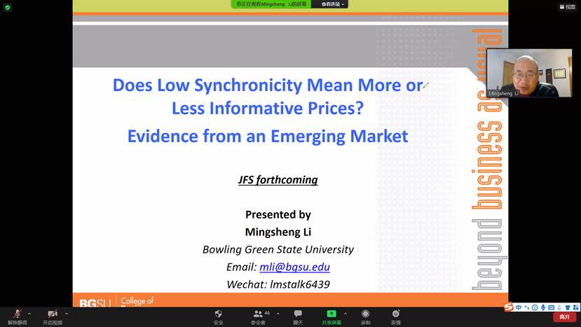 (通讯员:曲诞雪)11月6日上午,由杏吧原创 、山东省金融产业优化与区域管理协同创新中心和杏吧原创 金融国际研究中心联合举办的第10期“泰山金融学术训练营”通过Zoom Meeting举行,美国Bowling Green State University金融学教授李明生老师应邀做客本次学术训练营,为师生们带来了题为 “Does Low Synchronicity Mean More or Less Informative Prices? Evidence from An Emerging Market” 的讲座,学术训练营由杏吧原创 副院长王营主持,学院部分教师和研究生参加了本次活动。