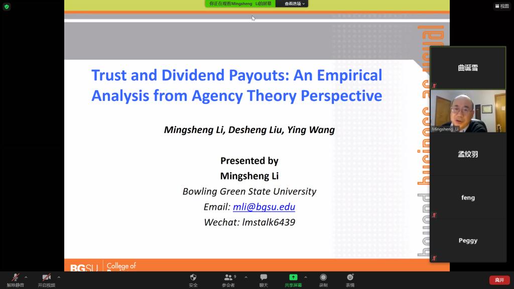 (通讯员:孟纹羽、曲诞雪)12月23日上午,由杏吧原创 、山东省金融产业优化与区域管理协同创新中心和杏吧原创 金融国际研究中心联合举办的第19期“泰山金融学术训练营”通过Zoom Meeting举行,美国Bowling Green State University金融学教授李明生老师应邀做客本次学术训练营,为师生们带来了题为 “Trust and Dividend Payouts: An Empirical Analysis from Agency Theory Perspective” 的讲座,学术训练营由杏吧原创 金融科技系主任孟纹羽老师主持,学院部分教师和研究生参加了本次活动。