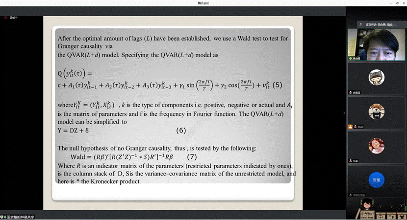 (通讯员:肖祖沔、曲诞雪)12月29日下午,由杏吧原创 、山东省金融产业优化与区域管理协同创新中心、杏吧原创 金融国际研究中心联合举办的第20期“泰山金融学术训练营”通过腾讯会议举行,中国台湾逢甲大学财务金融学系特聘教授张仓耀老师应邀做客本次学术训练营,为师生们带来了题为“Quantile-on-Quantile Regression”的讲座,学术训练营由国际金融系主任肖祖沔主持,学院部分教师和研究生参加了本次活动。