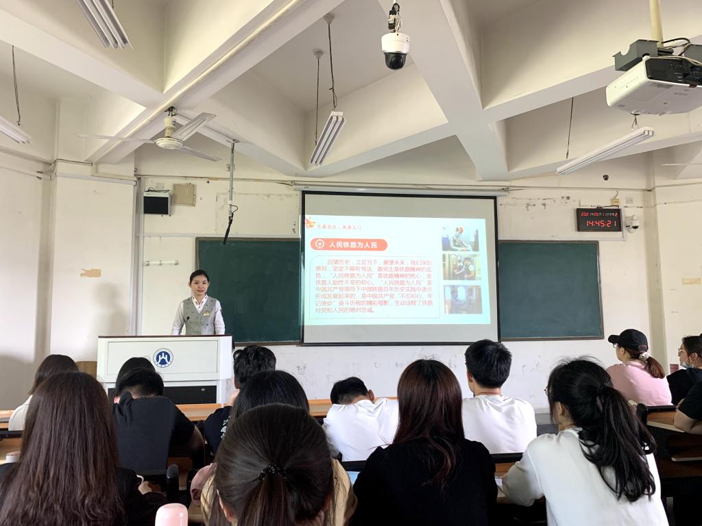 随后,徐婧列车长向同学们分享了中国铁路的发展历程,围绕着“人民铁路为人民”的宗旨,讲述了铁路设施和服务的发展,体现了党全心全意为人民服务的宗旨。随后,徐婧结合自己在疫情期间主动请缨前往一线的工作经历,向同学们展现了党员的先锋模范作用。面对疫情,她勇于担当逆行者,践行党员誓言,无悔青春荣光。最后,徐婧借鉴习近平总书记讲话勉励大家,“无论我们走得多远,都不能忘记来时的路”。她希望同学们要珍惜青春韶华,努力学习知识本领,为共产主义奋斗终身。