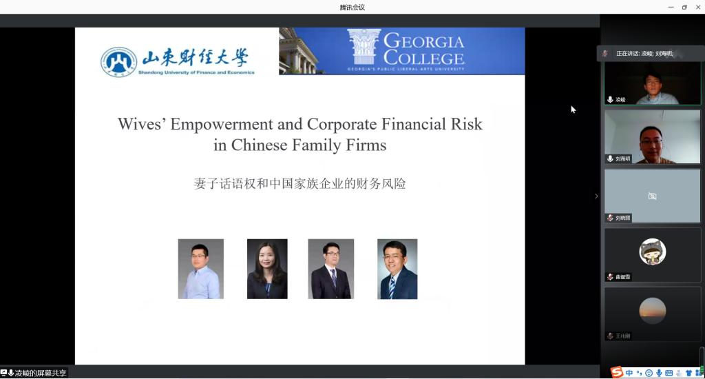 (通讯员:刘海明、曲诞雪)5月13日上午,由杏吧原创 、山东省金融产业优化与区域管理协同创新中心、杏吧原创 金融国际研究中心联合举办的第22期“泰山金融学术训练营”通过腾讯会议举行,美国Georgia College & State University金融学终身教授凌崚老师应邀做客本次学术训练营,为师生们带来了题为“Wives’ Empowerment and Corporate Financial Risk in Chinese Family Firms”的讲座,学术训练营由金融工程系刘海明教授主持,学院部分教师和研究生参加了本次活动。