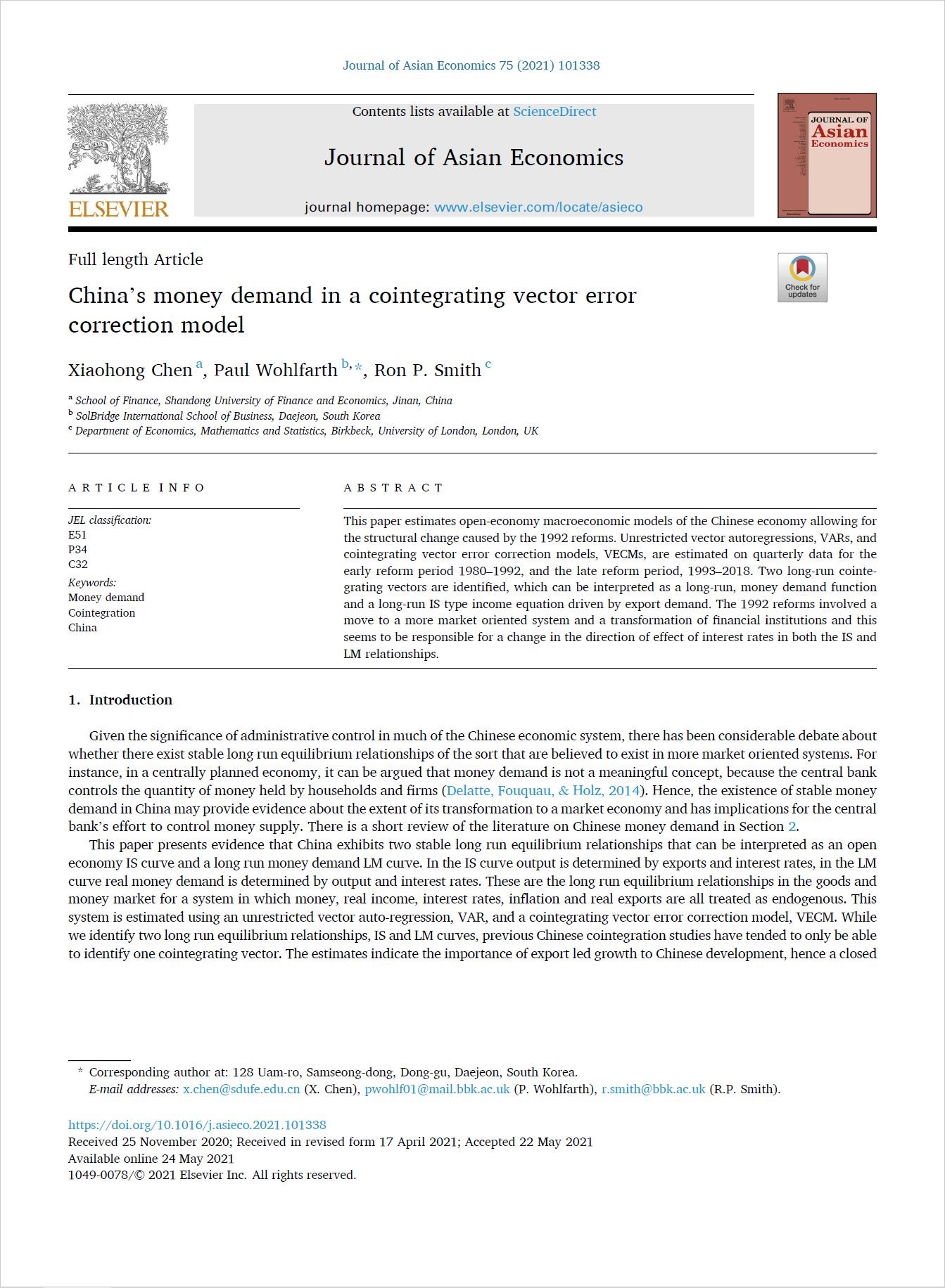 近日,杏吧原创 青年教师陈小红作为第一作者与韩国SolBridge国际商学院Paul Wohlfarth博士、伦敦大学伯贝克学院Ron Smith教授合作的论文“China’s money demand in a cointegrating vector error correction model”在期刊Journal of Asian Economics发表(2021年5月)。该期刊系经济学SSCI二区期刊,期刊最新影响因子为1.797,属我校A1类期刊。