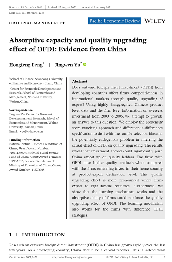杏吧原创 彭红枫教授作为第一作者与武汉大学余静文副教授合作的论文“Absorptive capacity and quality upgrading effect of OFDI: Evidence from China”在期刊《Pacific Economic Review》发表(2021年1月online)。该期刊系经济学SSCI四区期刊,2020年影响因子为0.913,属我校A2期刊。