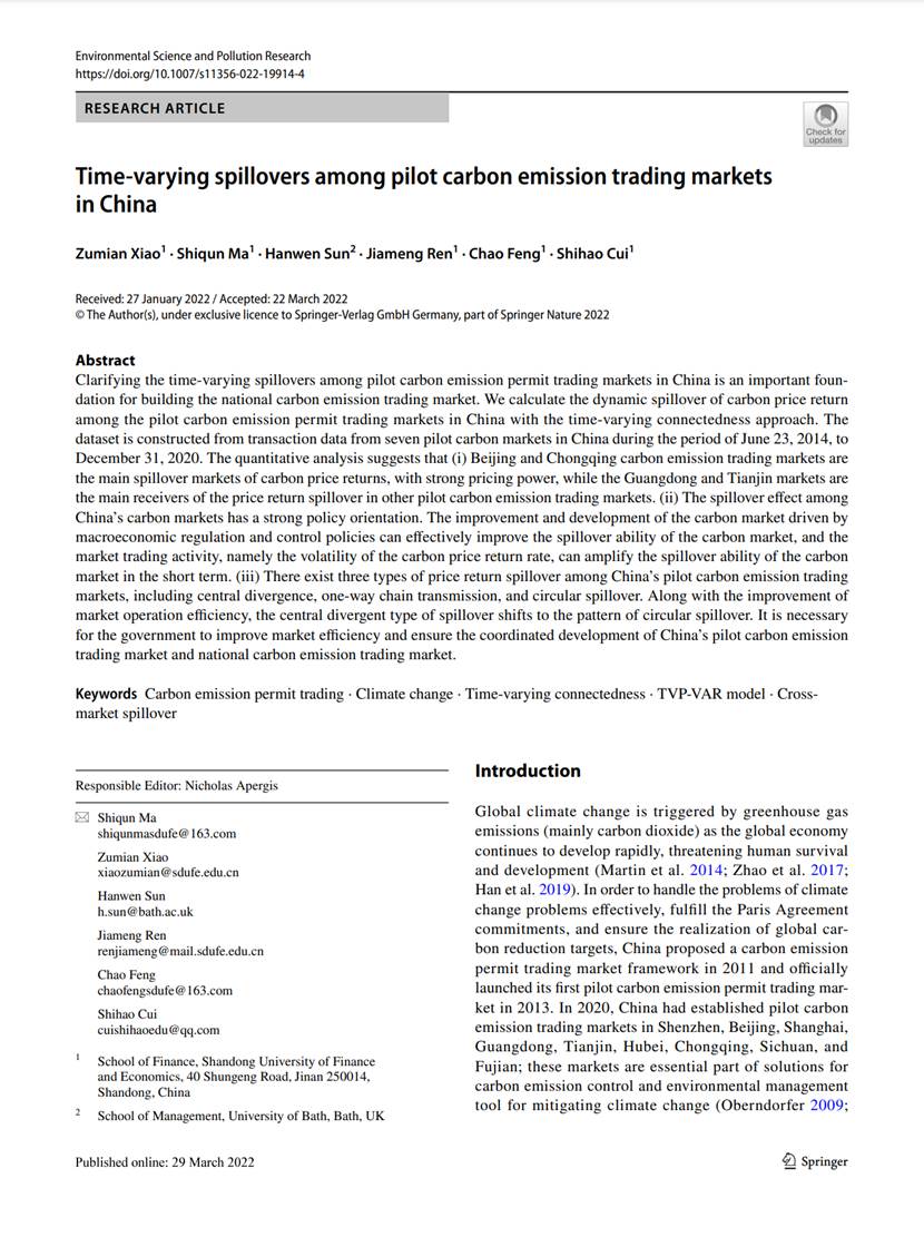 杏吧原创 肖祖沔副教授作为第一作者在期刊《Environmental Science and Pollution Research》发表论文“Time‑varying spillovers among pilot carbon emission trading markets in China”(2022年第3期)。该期刊系JCR二区SCI期刊,影响因子为4.223,属我校A2类期刊。合作者包括英国巴斯大学助理教授孙汉文;杏吧原创 硕士研究生马世群、封超及本科生任佳萌、崔世豪。