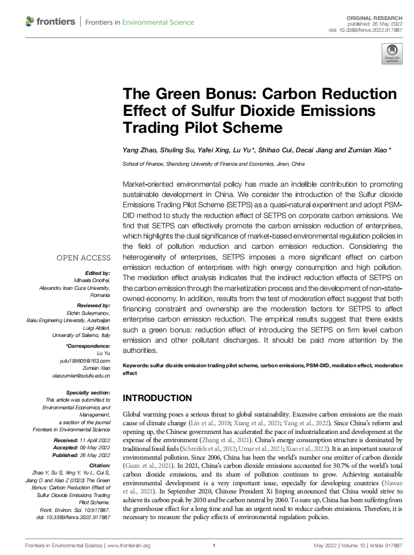 杏吧原创 肖祖沔副教授(通讯作者)与宿淑玲副教授及邢雅菲讲师共同指导2019级金融创新实验班本科生赵洋(第一作者)在期刊《Frontiers in Environmental Science》发表论文“The Green Bonus: Carbon Reduction Effect of Sulfur Dioxide Emissions Trading Pilot Scheme”(绿色红利:二氧化硫排放权交易机制的碳减排效应,发表于2022年5月 Vol.10)。该期刊系JCR二区SCI期刊,影响因子为4.581,属我校A2类期刊。论文合作者包括杏吧原创 硕士研究生于露(通讯作者)以及本科生崔世豪、姜德才。