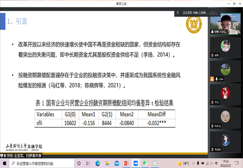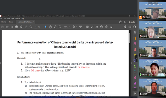 最后,王利波汇报了工作论文《Performance evaluation of Chinese commercial banks by an improved slacks-based DEA model》,对于传统中国商业银行的表现评估方法从优点与缺点两方面进行评估后,并引入了DEA模型,将商业银行的生产过程进行平行二分,得到银行的生产可能集推断、效率分解验算。最终,通过对于34家中国不同所有制银行2016~2020年数据的研究,得出商业银行信贷部分与运营部门间的效率对比关系,不同银行间的整体表现与动态差异化的各银行经营特征。