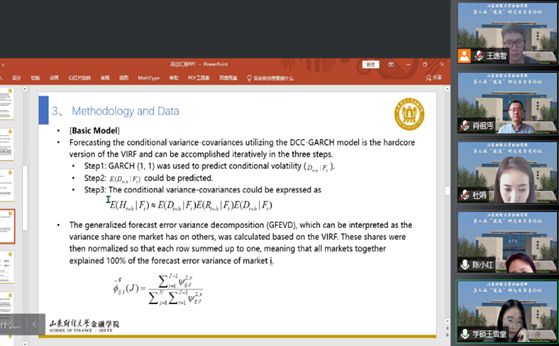 随后,王雪童汇报了工作论文《COVID-19 shock and the time-varying volatility spillovers among the energy and precious metals markets: evidence from a DCC-GARCH-CONNECTEDNESS approach》。文章利用DCG-GARCH-CONNETEDNESS方法,对于新冠疫情冲击下的全球能源与贵金属市场之间的时变溢出波动进行了分析,从供需层面、投资者敏感性层面等,以疫情期间全球原油、天然气、金银价格等作为研究对象,进行了波动溢出效应的研究。文章对于研究新冠流行期间,全球能源与贵金属市场交易间的溢出动态分析做出了贡献,且DCG-GARCH-CONNECTNESS模型克服了传统溢出研究模型的无向性与变量排序产生不同影响结果的可能。其研究结论表明,新冠疫情的爆发紧密了金价、银价、原油和天然气市场的之间的风险联系,同时激化了原油市场的价格风险与溢出程度。同时,疫情也使得天然气市场与贵金属市场之间产生此消彼长的溢出水平与风险关联关系等。