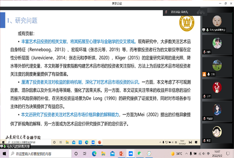 最后,马永凡汇报了工作论文《投资者关注与艺术品投资收益:信息优势还是风险补偿?—来自书画拍卖市场的证据》。该文从艺术品市场出发,基于百度搜索指数与微观拍卖数据,分析了艺术品市场投资者关注对投资收益的影响。该文丰富了艺术品投资相关文献,深化了对艺术品市场投资的认识。点评老师指出关注度指标使用的关键词需要权威文献做支撑;除了投资者,其他关注者也会百度搜索,数据的真实性有待考究,且百度搜索需要剔除广告的影响;投资者关注与投资收益间双向影响的问题需要解决;该文默认两次交易间的关注度不变,这与实际不太相符,且需要做年化收益率使持有期保持一致。