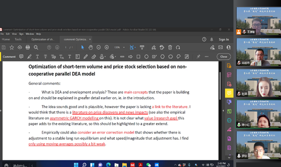 与会老师对于本论文进行了工作上的肯定,并且提出了合理的意见与修改建议。老师们主要针对模型的验算展示、理论的支撑方面提供了需要完善、解释、补充的意见与建议。同时,针对非传统模型在金融领域的使用,如何将二者更完美地融合并进行定位也同样重要。