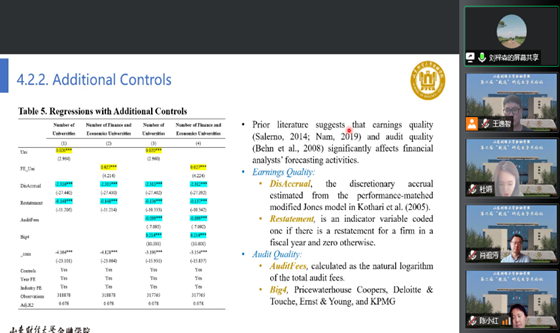 四位老师对罗钦同学的论文进行了评价与指证。与会老师肯定了该文章的思路与创新性,并对文章的修改、投递方向提出了修改意见。同时,与会老师们对于文章中存在的关于引言与文献综述的丰富,对于模型的构建与概念的解释方面、以及关于题目、关键性概念名词阐述的方式以及删增提出了建设性意见。另外,与会老师提到关于稳健性检验与结果展示存在一定的改进空间。