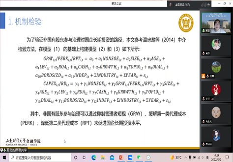 随后,王金梦汇报了工作论文《中小股东网络投票对企业创新的影响研究》,文章构建了中小股东参与网络投票对企业创新影响的理论框架,提出中小股东参与网络投票影响企业创新的相关假说,并进行了实证检验和机制分析。点评老师们认为文章的理论机制分析需要进一步充实,研究贡献部分语言尚不完善,并且文献梳理部分需要进一步精炼,文章的被解释变量的指标有待丰富,将来的研究可以从创新产出和创新投入两个角度进行回归。此外,稳健性检验可以考虑剔除直辖市的样本。
