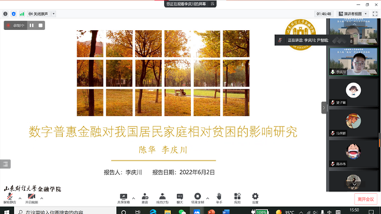 随后,李庆川汇报了工作论文《数字普惠金融对居民家庭相对贫困的影响研究》,该文在理论研究基础上,采用中国家庭金融调查数据,实证分析数字普惠金融对居民家庭多维相对贫困的影响。实证结果表明数字普惠金融整体上能够有效减缓相对贫困,整体来看,相较于发达地区,欠发达地区能够从数字普惠金融的发展中获益更多,此外,数字普惠金融对老年户主家庭的减贫效应并不显著,数字鸿沟问题在老年群体中依然突出;在机制分析中,数字普惠金融可以通过缓解信贷约束、促进居民创业来减缓相对贫困。点评老师们指出虚拟变量的设置、相对贫困与绝对贫困概念的区分、样本分组等方面提出了建设性意见。
