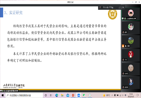 随后,王玉玺汇报了工作论文《结构性货币政策与民营企业融资约束》。该文从民营企业融资难的现状出发,分析了定向降准、常备借贷便利和中期借贷便利三种结构性货币政策工具对于缓解民营企业融资约束的政策效果。同时,进一步按照外部融资比率和银行信贷比率,通过对民营企业分组考察缓解民营企业融资约束的效果。该文利用实证分析检验了中央银行应创新货币政策工具,综合利用多种政策工具的重要性。五位老师肯定了文章的研究工作,并指出了文中需要改进的地方,如:控制组和对照组的定义与选取未写;通常控制组和对照组需要通过DID分析,但论文并未使用;SA指数做被解释变量不易解释,KZ指数不易测量,建议采用其他衡量方法;结构性货币政策指数的测量需要权威文献做支撑;货币政策并不单独针对民营企业,文章的研究动机还需进一步提炼。