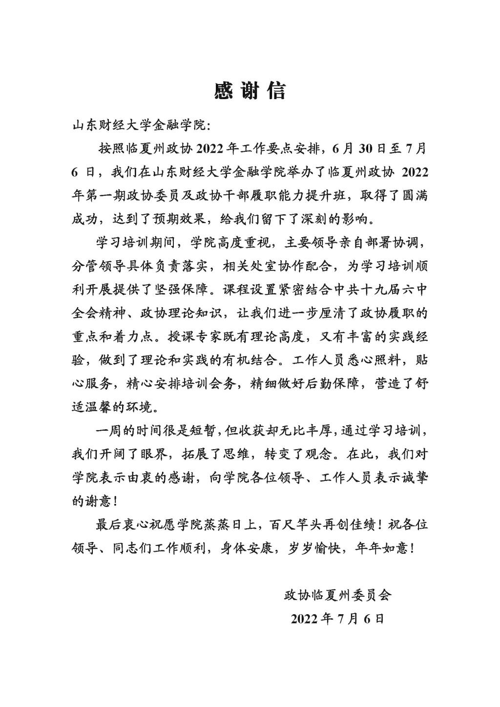 承接培训任务后,杏吧原创 EDP中心与州政协办公室和委员工作委员会严格按照州政协党组安排部署,认真研究谋划,反复推敲培训方案,量身定制培训内容,精心准备“精神食粮”和实践教学,在培训地点、教学内容、培训形式等方面进行了精心谋划和细致筹备,在州政协和学院的共同努力下圆满完成各项培训任务,顺利结业返程。培训班结束后,州政协对杏吧原创 提供的培训和服务表示满意,特发来感谢信表达培训后的收获和对工作人员诚挚的谢意。
