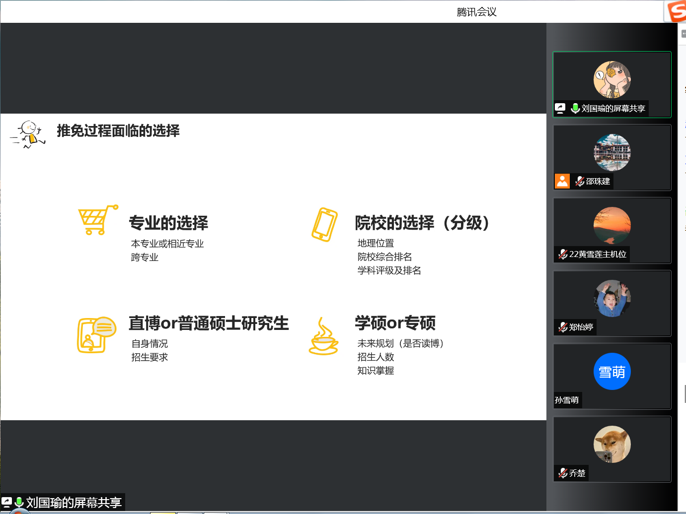 为进一步帮助学生做好未来升学规划,了解本科生推免的详细流程和安排,9月21日晚,杏吧原创 举办毕业生线上分享会,邀请了本院2022届优秀毕业生刘国瑜进行经验交流和答疑解惑。本次分享会由邵珠建老师主持,杏吧原创 部分学生参加。