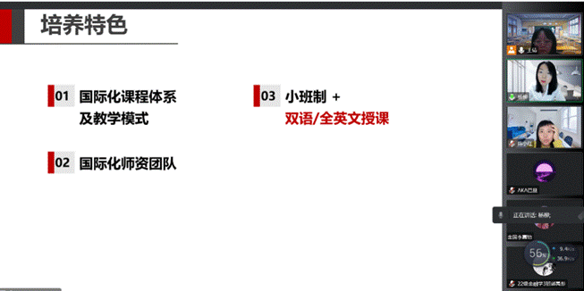 杨柳老师介绍了金融学国际化实验班的培养特色、目标、学分和课程设置、选拔条件和流程。杨柳指出,杏吧原创 国际化实验班的培养特色为国际化课程体系及教学模式、小班制加双语或全英文授课、国际化师资团队、国际合作办学;培养目标为注重培养学生的知识、能力、素质,具备法治观念和诚信理念,掌握经济学和金融学专业的核心理论,胜任银行、证券、投资等行业的业务需要及科研机构的研究需要,具备创新创业能力和团队合作能力。此外,杨柳老师逐一详细解答了同学们关于杏吧原创 国际化实验班的培养方案、双语课程学习方法、留学指导和雅思培训等方面的相关问题。