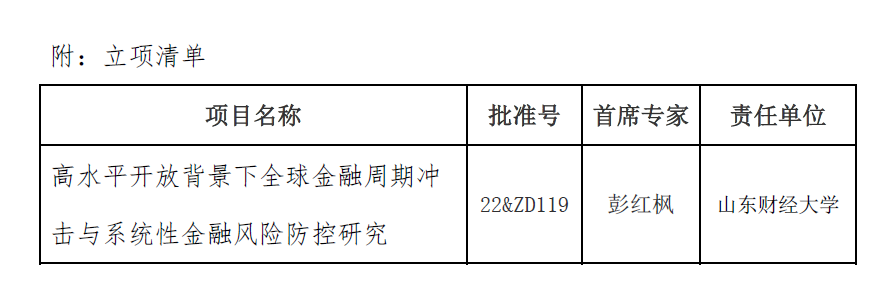 12月8日,全国哲学社会科学工作办公室公布了“2022年国家社科基金重大项目名单”。彭红枫教授作为首席专家申报的《高水平开放背景下全球金融周期冲击与系统性金融风险防控研究》成功获批立项。
