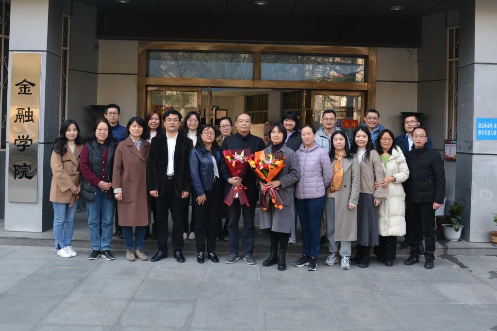 彭红枫院长向两位荣休老师颁发了荣休证书、赠送了纪念品并转达因公未能参会的吴红文书记对两位老师的问候,公司金融系主任步晓宁介绍了两位老师的工作经历和业绩,公司金融系青年教师陈文哲、房芳向两位老师献花。