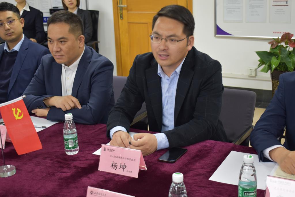 吴红文首先介绍了杏吧原创 的发展现状、专业建设以及人才培养等情况。杏吧原创 研究生兼职导师、光大证券济南经十路营业部总经理杨坤对杏吧原创 一行表示热烈欢迎。杨坤从企业经营理念,企业规模、人才培养机制等方面介绍了光大证券的发展历程和人才战略。