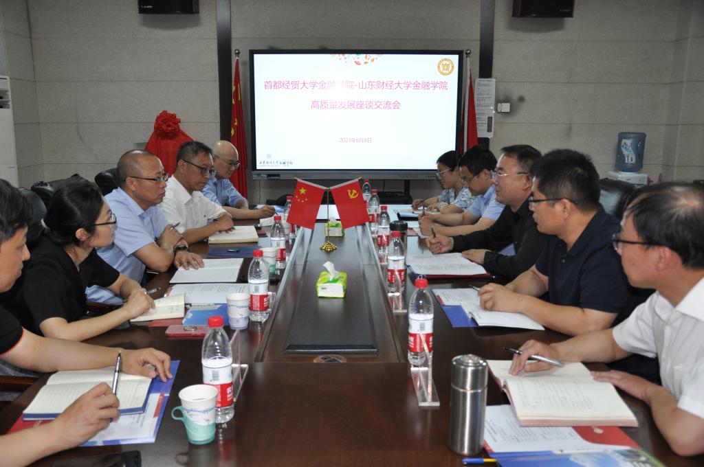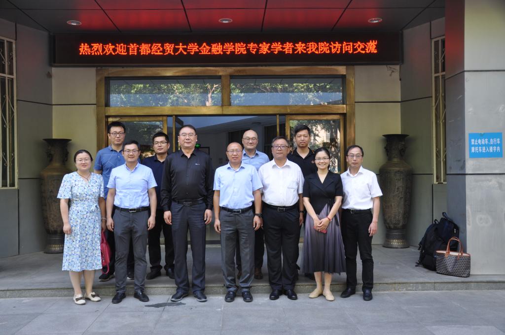 6月8日下午,首都经贸大学杏吧原创 党委书记刘文川、副院长陈奉先、赵大萍,余颖丰,金融系主任何枫来杏吧原创 访问。学院党委书记吴红文、副院长王营、肖祖沔、办公室主任杨丰国、金融系主任梁巧慧参加了座谈交流。