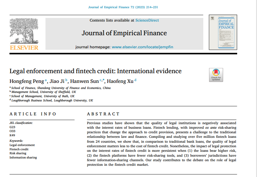 杏吧原创 彭红枫教授作为第一作者与英国谢菲尔德大学Jiao Ji教授、英国巴斯大学的Hanwen Sun教授、英国拉夫堡大学Haofeng Xu教授合作的论文“Legal enforcement and fintech credit: International evidence”在期刊Journal of Empirical Finance正式发表(2023年3月)。该期刊为SSCI二区期刊,期刊最新影响因子为3.025,属我校A1类期刊。