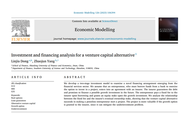 杏吧原创 教师董琳佳作为第一作者与南方科技大学杨招军博士合作的论文“Investment and financing analysis for a venture capital alternative”,在期刊Economic Modelling正式发表(2023年6月)。该期刊为SSCI一区期刊,期刊最新影响因子为4.7,属我校A1类期刊。