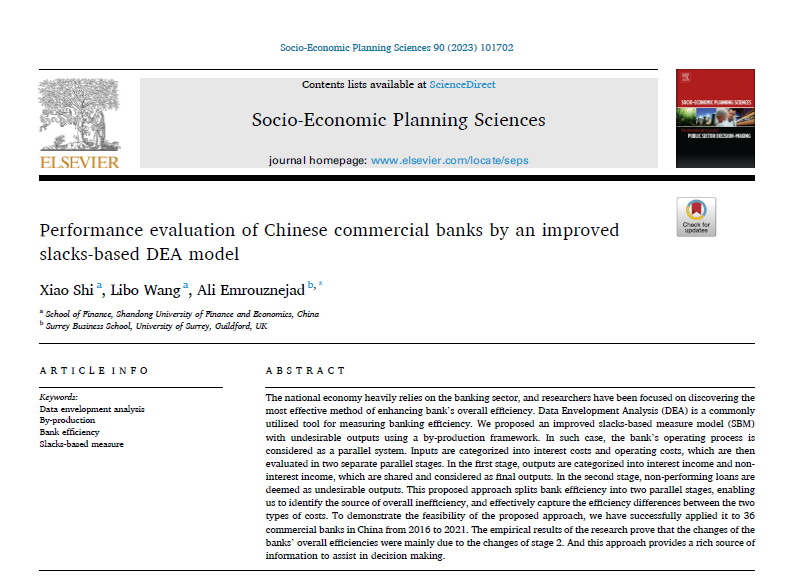 杏吧原创 石晓副教授作为第一作者与硕士研究生王利波、英国萨里大学Ali Emrouznejad教授合作的论文“Performance evaluation of Chinese commercial banks by an improved slacks-based DEA model”在期刊Socio-Economic Planning Sciences正式发表(2023, Vol. 90, Issue: Dec)。该期刊为SSCI一区期刊,期刊最新影响因子为6.1,属我校A1类期刊。