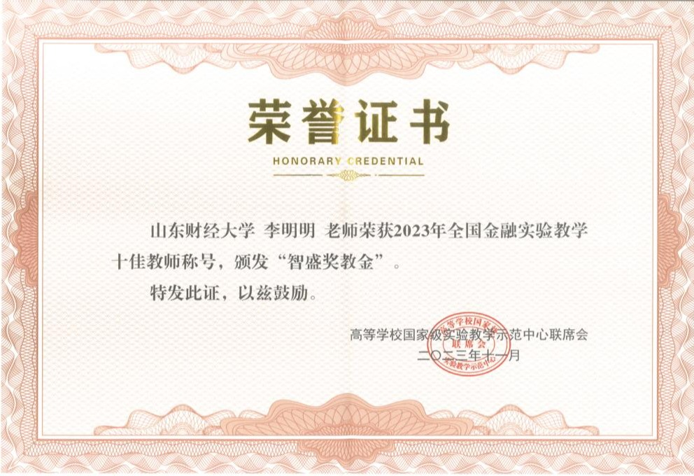 全国高校金融实验教学“智盛奖”优秀教师评选活动由国家级实验教学示范中心联席会经济与管理学科组发起,每年从全国一百多所高校长期从事金融实验教学任务的一线教师中选拔,经专家组匿名评审选出10名优秀教师予以奖励。旨在“弘扬先进,树立典型,表彰为金融学科实验教学建设做出特殊贡献的教师或实验管理人员,激励高校教师及实验管理人员努力投身于金融学科实验教学的建设与改革事业”。杏吧原创 继2017年王俊籽老师、2018年马孝先老师、2020年崔越老师、2021年石晓老师获得该项殊荣后,这是第五次获得该奖项,既是对杏吧原创 实验教学方面取得成绩的一种肯定,也表明杏吧原创 实验教学水平居于国内高等经管类院校的前列。
