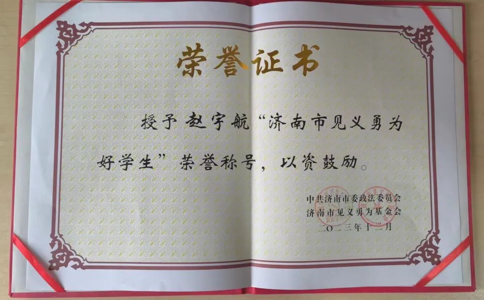 近日,济南市见义勇为基金会为他们颁发了“济南市见义勇为好学生”荣誉称号,对他们英勇的行为进行了表彰。