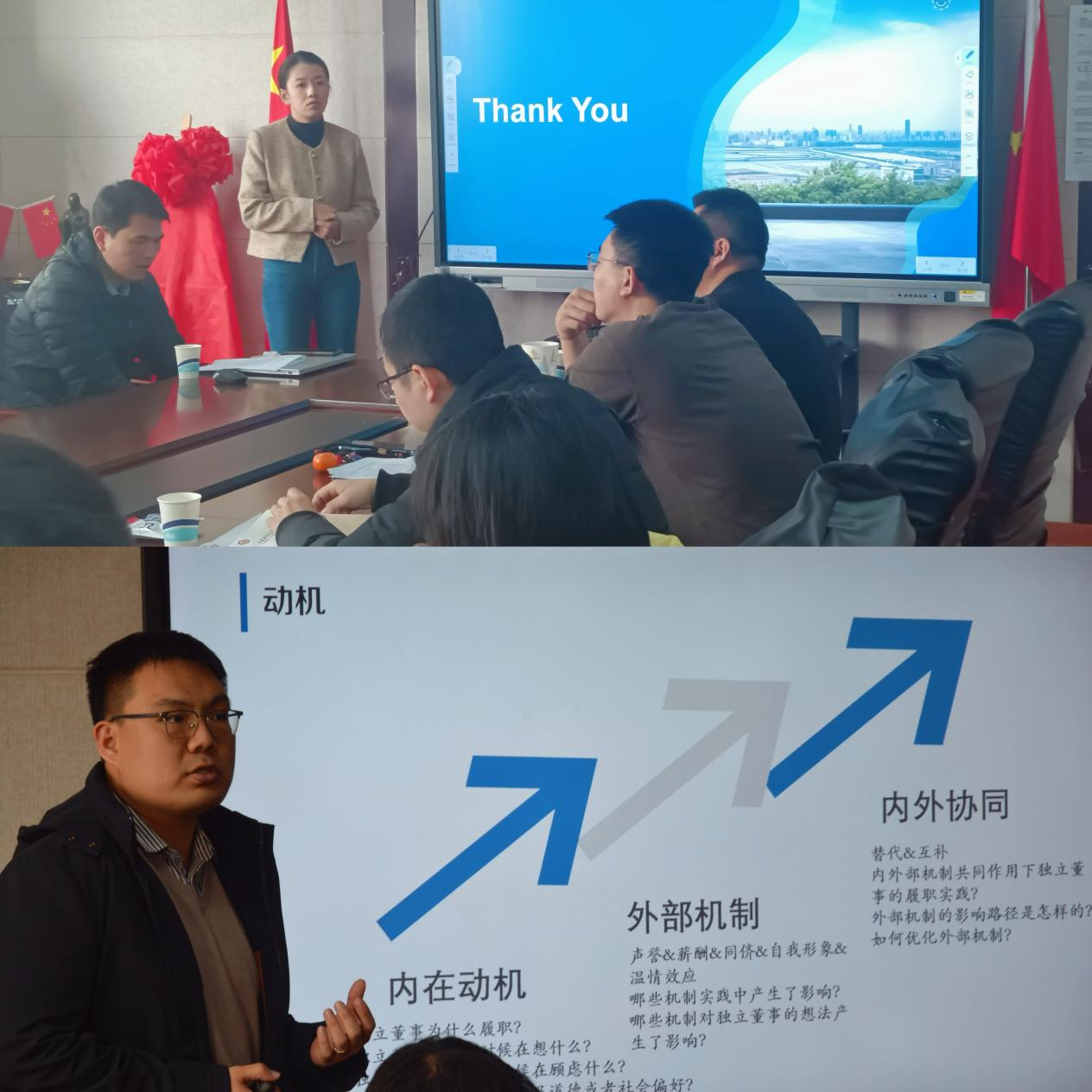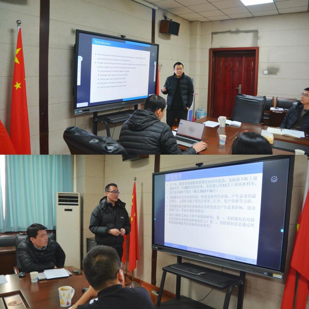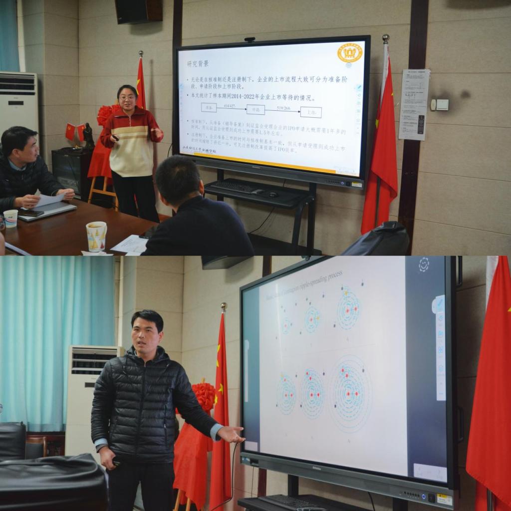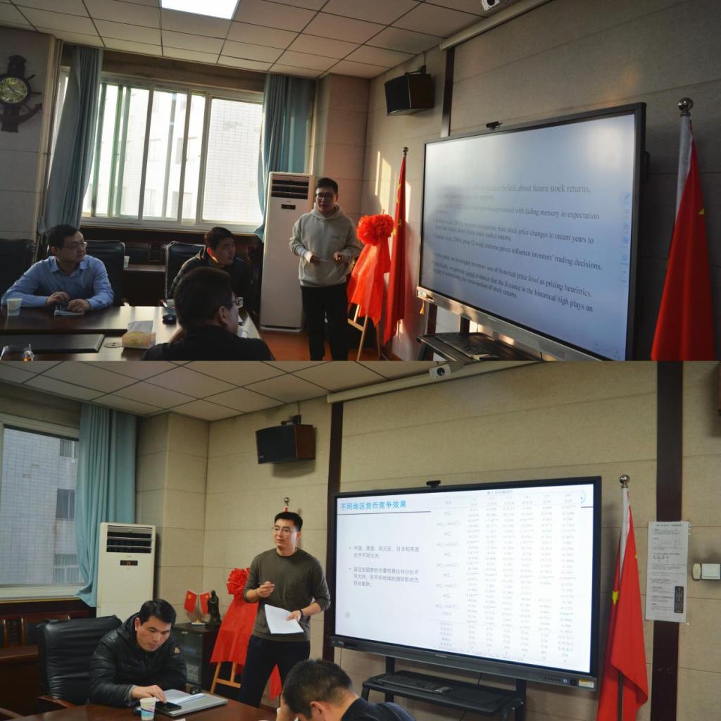 8名教师汇报了近期研究成果,其主题包括VIX定价、美联储加息与经济波动、上市等待期与企业生产效率、原有冲击的连锁反应、城乡收入差距、独立董事的履职行为、股票定价是否遵循启发式推断、国际货币竞争等。学术报告者从观点的提出、方案设计、研究结果和结论等方面对研究成果进行了展示,与会教师从多个方面对论文进行了详细的点评并展开自由讨论,为汇报者明确研究定位、完善研究成果提供了宝贵意见。