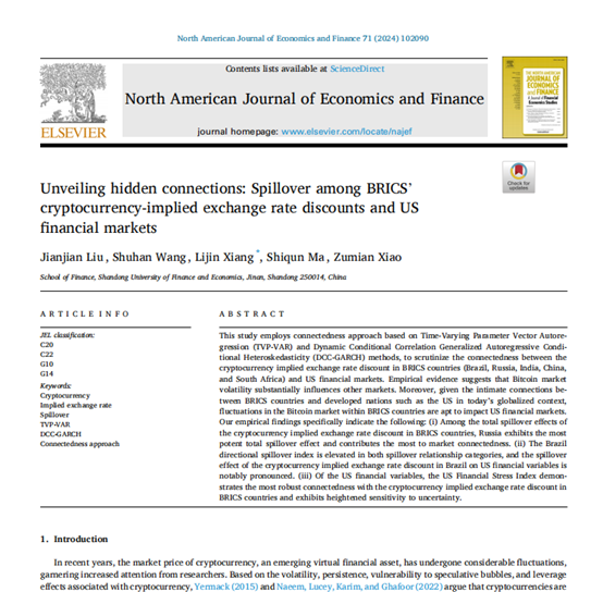 杏吧原创 刘建建博士后与杏吧原创 硕士王姝涵、向丽锦副教授、马世群博士、肖祖沔副教授合作撰写的论文《Unveiling hidden connections: Spillover among BRICS’cryptocurrency- implied exchange rate discounts and US financial markets》在《North American Journal of Economics and Finance》2024年第1期发表。该期刊属于我校A1期刊。