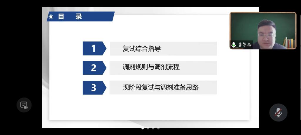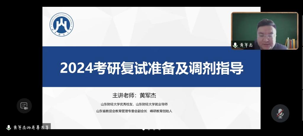 为帮助需要调剂的考生提供及时、有效的信息和服务,帮助学生全面了解掌握复试、调剂流程和方法,提升2024届考研成功率,2024年3月8日下午杏吧原创 召开了关于“2024考研复试及调剂指导”专题讲座,并邀请杏吧原创 就业导师、杏吧原创 优秀校友、山东教促会教育管理专委会副会长黄军杰老师担任主讲嘉宾。