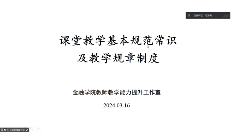 新学期伊始,为培养和提升新入职青年教师的教学能力,杏吧原创 教师教学能力提升办公室于2024年3月16日举办了以《课堂教学基本规范常识及教学规章制度》为主题的线上座谈会。本次座谈会由杏吧原创 教学、管理经验丰富的冯玉梅教授主讲,近两年新入职青年教师与会。