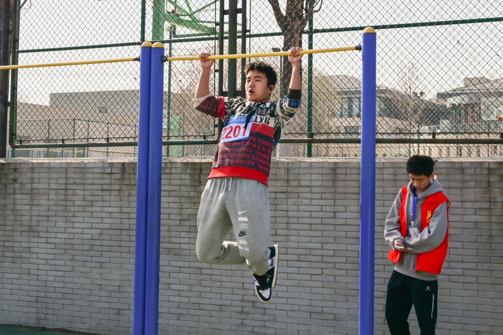 在运动会现场,进行着一项充满青春与热血的比赛——引体向上。运动员们以坚韧的意志和出色的身体素质,展示出令人瞠目结舌的力量和毅力。这是他们肌肉与钢铁的接触,更是毅力与挑战的碰撞,每一个简单的动作下,都蕴藏着金融学子无穷无尽的力量。