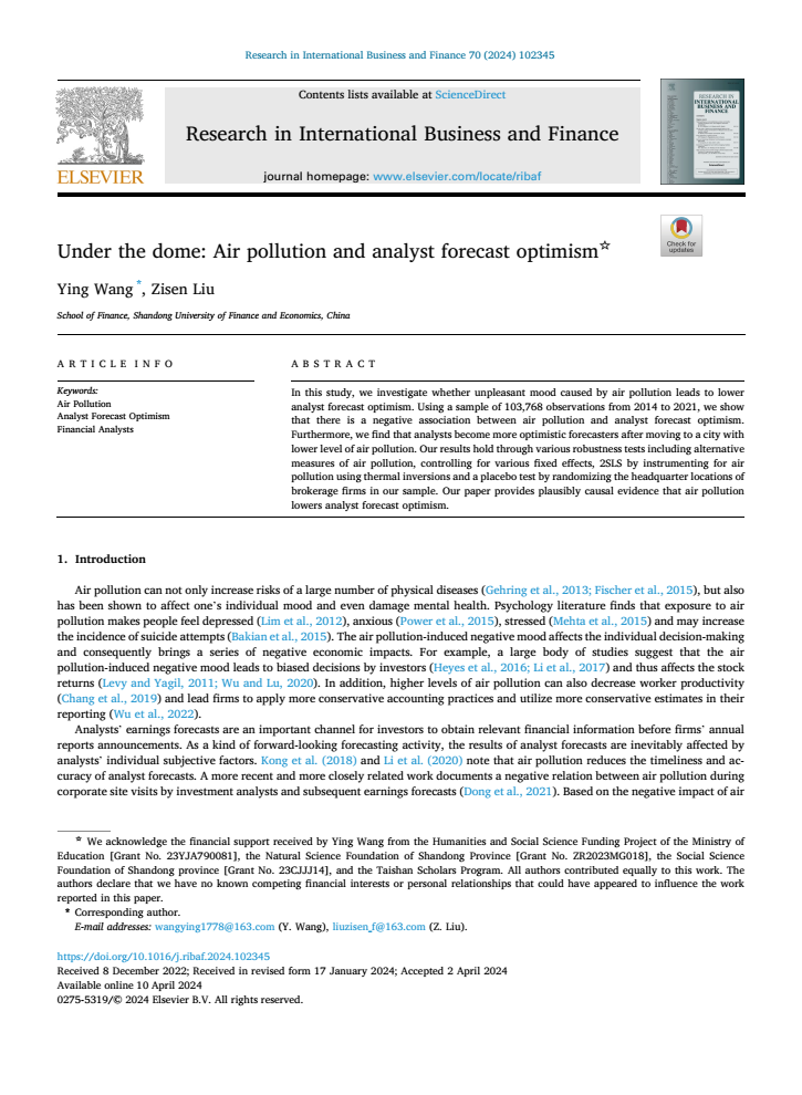 杏吧原创 王营教授和研究生刘梓森同学合作的学术论文《Under the dome: Air pollution and analyst forecast optimism》在《Research in International Business and Finance》2024年第70卷Part A发表。该期刊系我校A1类期刊。
