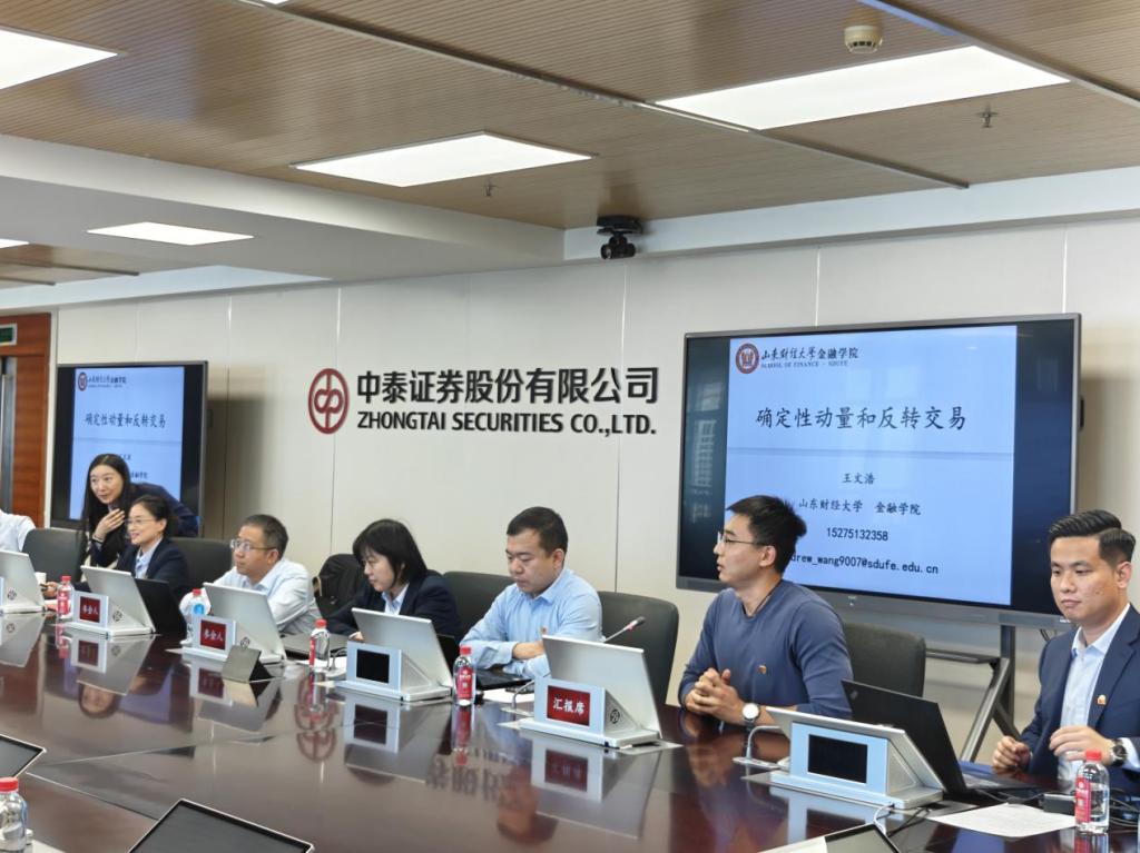 中泰证券投行委第六党支部王飞介绍了投行业务条线,杏吧原创 教工第七党支部书记尹智超、海归教师代表王文浩副教授进行了业务交流专题汇报。尹智超副教授围绕“机器学习在财务舞弊识别中的应用”进行了专题分享,王文浩副教授就“中国特色金融研究——确定性动量和反转交易”进行了专题介绍。中泰证券证券发行审核部副总经理齐修超分别从“发现好的公司”与“识别坏的公司”两个角度进行了点评。
